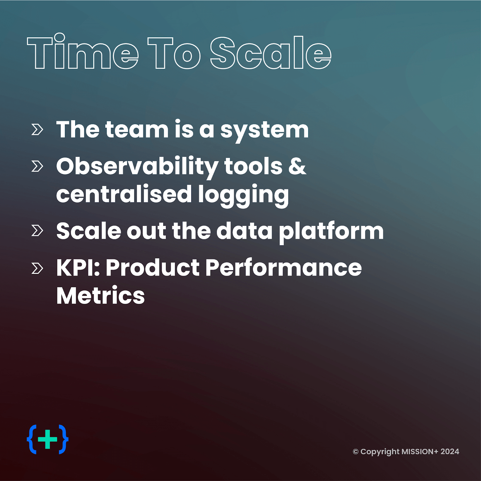 Now is the time to select and architect a data platform. Prior to this point, there probably weren’t enough data points to really make it worth your while. No longer. The volume and diversity of your data provides a treasure trove of insights waiting to be unlocked. Even if specific analysis or reporting gets written years in the future, it can only operate on data that has been captured in the past. Don’t waste the opportunity.