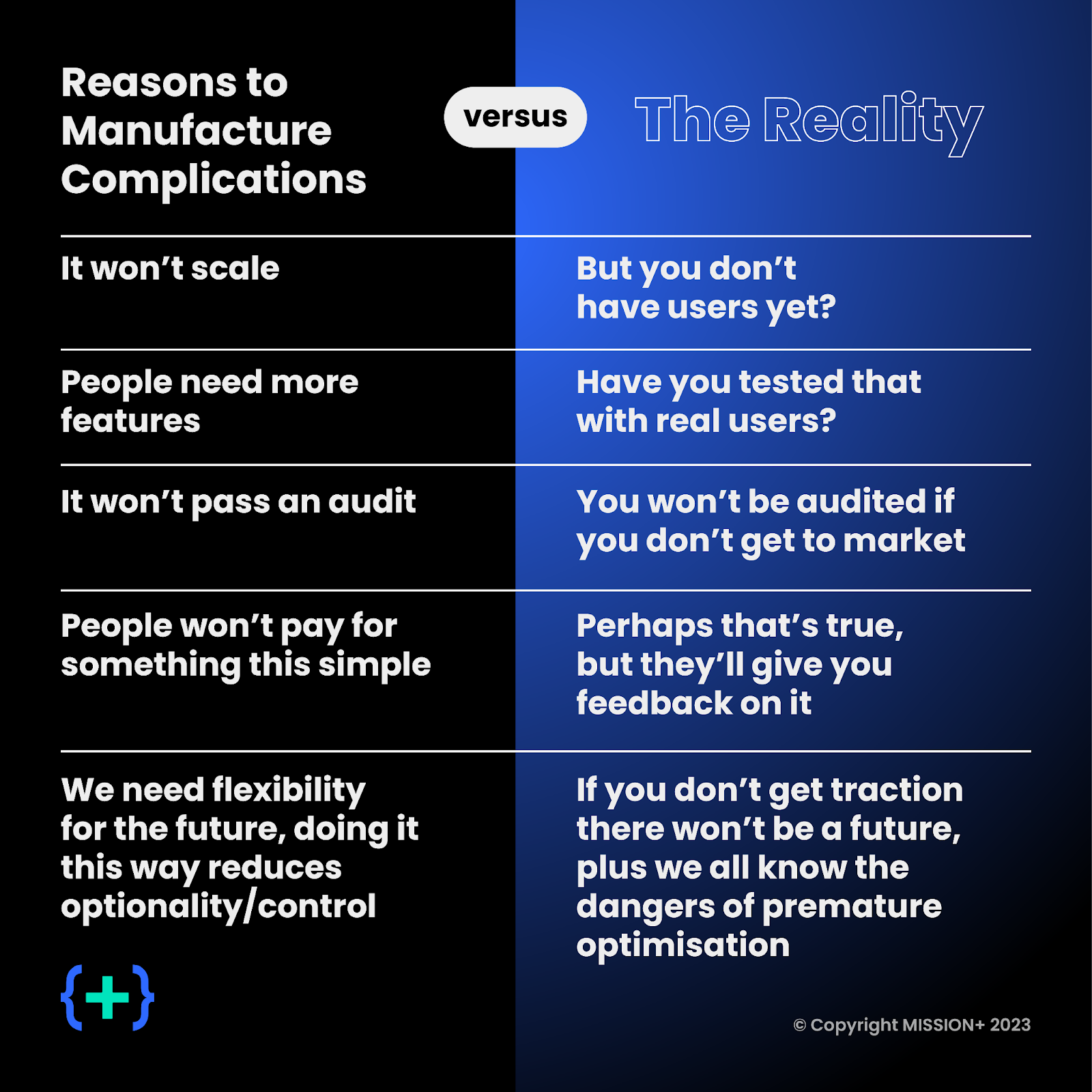 We’ve all heard of “KISS” (Keep It Simple Stupid), but in practice, many builders err towards complexity, even when we think we’re keeping things simple. This leads us to build feature-rich products that are ready for scale - but the scale never comes, because we’ve built something that isn’t quite what our users want. I believe this was one of my biggest shortcomings until relatively recently - I operated within the range of “comfortably simple”.